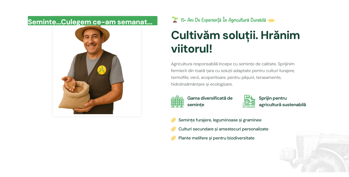 - Ferme vegetale și zootehnice – fermierii au nevoie de furaje stabile, de rotații eficiente și de culturi care să mențină fertilitatea solului. Semințele de lucernă, trifoi, sorg și raigras sunt esențiale pentru hrana animalelor și pentru sustenabilitatea fermelor.